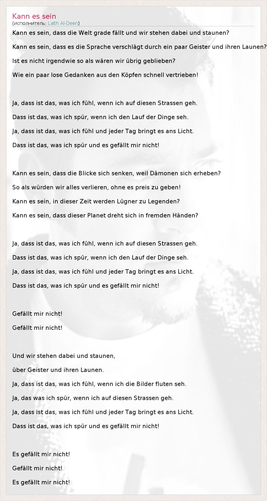Kann es sein, dass die Welt grade fällt und wir stehen dabei und staunen? Kann es sein, dass es die Sprache verschlägt durch ein paar Geister und ihren Launen? Ist es nicht irgendwie so als wären wir übrig geblieben? Wie ein paar lose Gedanken aus den Köpfen schnell vertrieben! Ja, dass ist das, was ich fühl, wenn ich auf diesen Strassen geh. Dass ist das, was ich spür, wenn ich den Lauf der Dinge seh. Ja, dass ist das, was ich fühl und jeder Tag bringt es ans Licht. Dass ist das, was ich spür und es gefällt mir nicht! Kann es sein, dass die Blicke sich senken, weil Dämonen sich erheben? So als würden wir alles verlieren, ohne es preis zu geben! Kann es sein, in dieser Zeit werden Lügner zu Legenden? Kann es sein, dass dieser Planet dreht sich in fremden Händen? Ja, dass ist das, was ich fühl, wenn ich auf diesen Strassen geh. Dass ist das, was ich spür, wenn ich den Lauf der Dinge seh. Ja, dass ist das, was ich fühl und jeder Tag bringt es ans Licht. Dass ist das, was ich spür und es gefällt mir nicht! Gefällt mir nicht! Gefällt mir nicht! Und wir stehen dabei und staunen, über Geister und ihren Launen. Ja, dass ist das, was ich fühl, wenn ich die Bilder fluten seh. Ja, das was ich spür, wenn ich auf diesen Strassen geh. Ja, dass ist das, was ich fühl und jeder Tag bringt es ans Licht. Dass ist das, was ich spür und es gefällt mir nicht! Es gefällt mir nicht! Gefällt mir nicht! Es gefällt mir nicht!