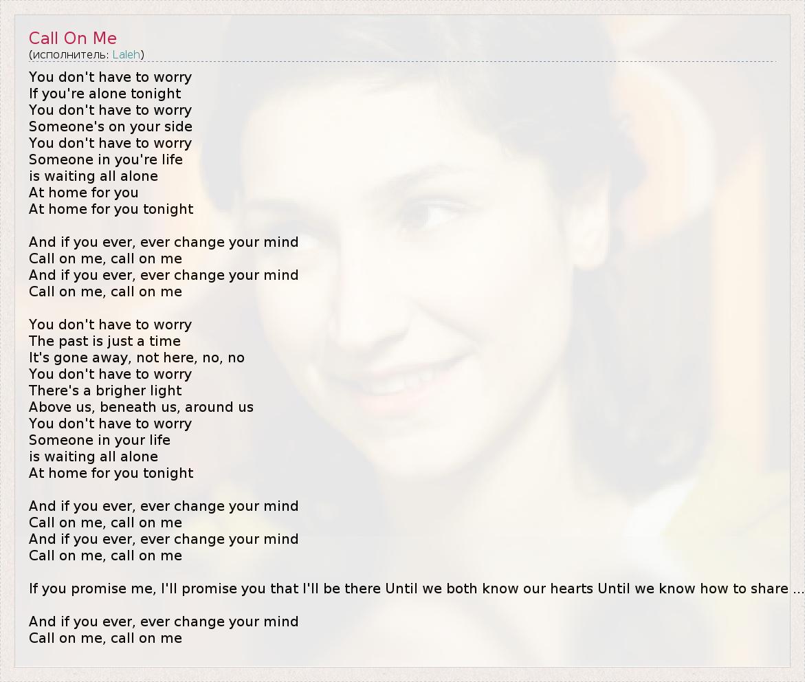 You don't have to worry If you're alone tonight You don't have to worry Someone's on your side You don't have to worry Someone in you're life is waiting all alone At home for you At home for you tonight And if you ever, ever change your mind Call on me, call on me And if you ever, ever change your mind Call on me, call on me You don't have to worry The past is just a time It's gone away, not here, no, no You don't have to worry There's a brigher light Above us, beneath us, around us You don't have to worry Someone in your life is waiting all alone At home for you tonight And if you ever, ever change your mind Call on me, call on me And if you ever, ever change your mind Call on me, call on me If you promise me, I'll promise you that I'll be there Until we both know our hearts Until we know how to share ... And if you ever, ever change your mind Call on me, call on me