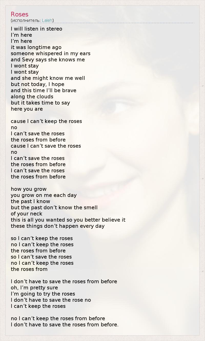 I will listen in stereo I’m here I’m here it was longtime ago someone whispered in my ears and Sevy says she knows me I wont stay I wont stay and she might know me well but not today, I hope and this time I’ll be brave along the clouds but it takes time to say here you are cause I can’t keep the roses no I can’t save the roses the roses from before cause I can’t save the roses no I can’t save the roses the roses from before I can’t save the roses the roses from before how you grow you grow on me each day the past I know but the past don’t know the smell of your neck this is all you wanted so you better believe it these things don’t happen every day so I can’t keep the roses no I can’t keep the roses the roses from before so I can’t save the roses no I can’t keep the roses the roses from I don’t have to save the roses from before oh, I’m pretty sure I’m going to try the roses I don’t have to save the rose no I can’t keep the roses no I can’t keep the roses from before I don’t have to save the roses from before.