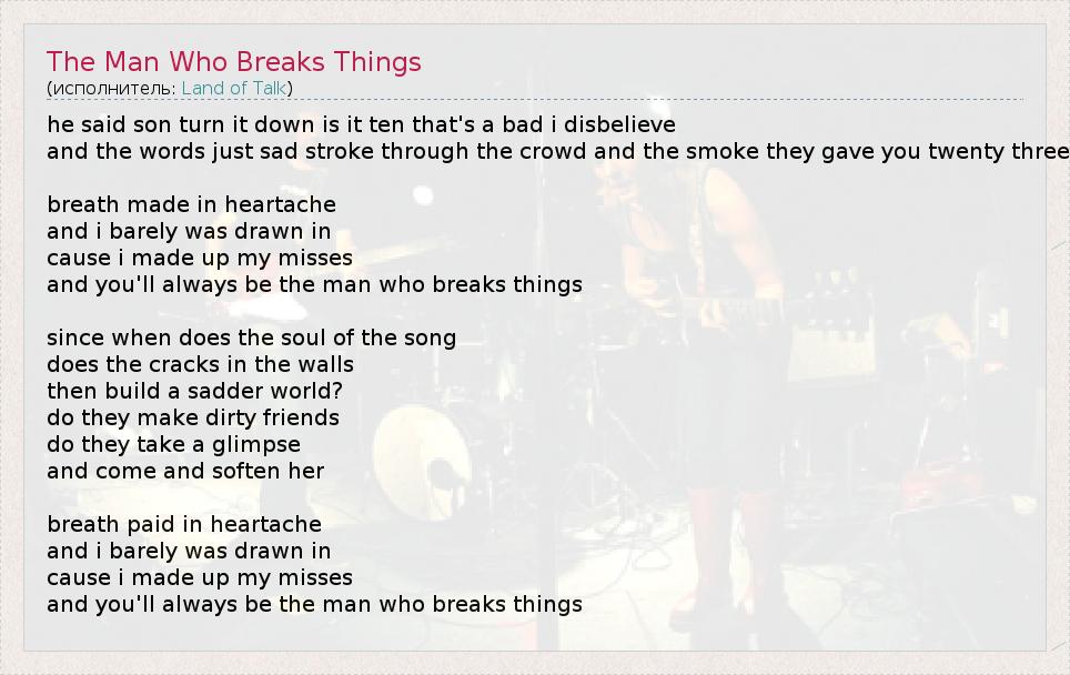 ГлавнаяИсполнителиLand of TalkThe Man Who Breaks Things