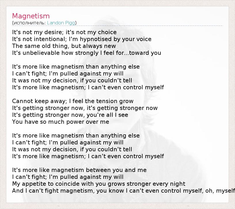 It's not my desire; it's not my choice It's not intentional; I'm hypnotised by your voice The same old thing, but always new It's unbelievable how strongly I feel for...toward you It's more like magnetism than anything else I can't fight; I'm pulled against my will It was not my decision, if you couldn't tell It's more like magnetism; I can't even control myself Cannot keep away; I feel the tension grow It's getting stronger now, it's getting stronger now It's getting stronger now, you're all I see You have so much power over me It's more like magnetism than anything else I can't fight; I'm pulled against my will It was not my decision, if you couldn't tell It's more like magnetism; I can't even control myself It's more like magnetism between you and me I can't fight; I'm pulled against my will My appetite to coincide with you grows stronger every night And I can't fight magnetism, you know I can't even control myself, oh, myself