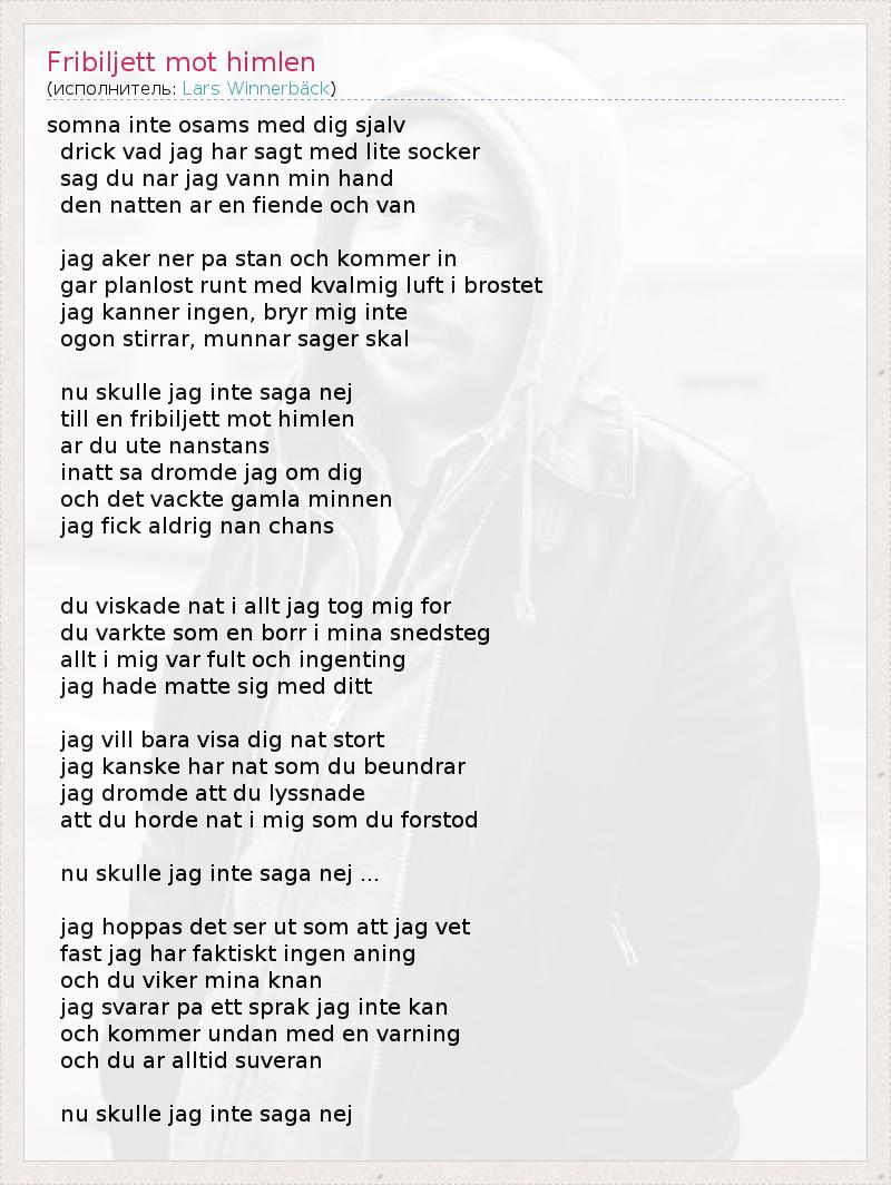 Это интересно:Lars Winnerbäck — один из самых популярных шведских singers/songwriters последней декады. Оттолкнувшись от звука поп-фолка, Ларс приблизился року поздних 90-х. В своей самой недавней работе Ларс снова вернулся к акустическому звучанию. Родившись в городе Linköping, Ларс уехал в Стокгольм, где и достиг успеха в музыкальной карьере. Оба города часто отражаются в текстах его песен.
