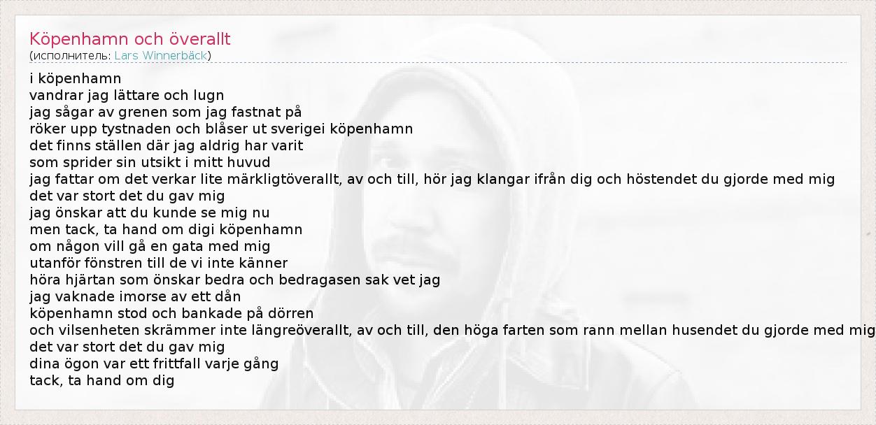 Это интересно:Lars Winnerbäck — один из самых популярных шведских singers/songwriters последней декады. Оттолкнувшись от звука поп-фолка, Ларс приблизился року поздних 90-х. В своей самой недавней работе Ларс снова вернулся к акустическому звучанию. Родившись в городе Linköping, Ларс уехал в Стокгольм, где и достиг успеха в музыкальной карьере. Оба города часто отражаются в текстах его песен.