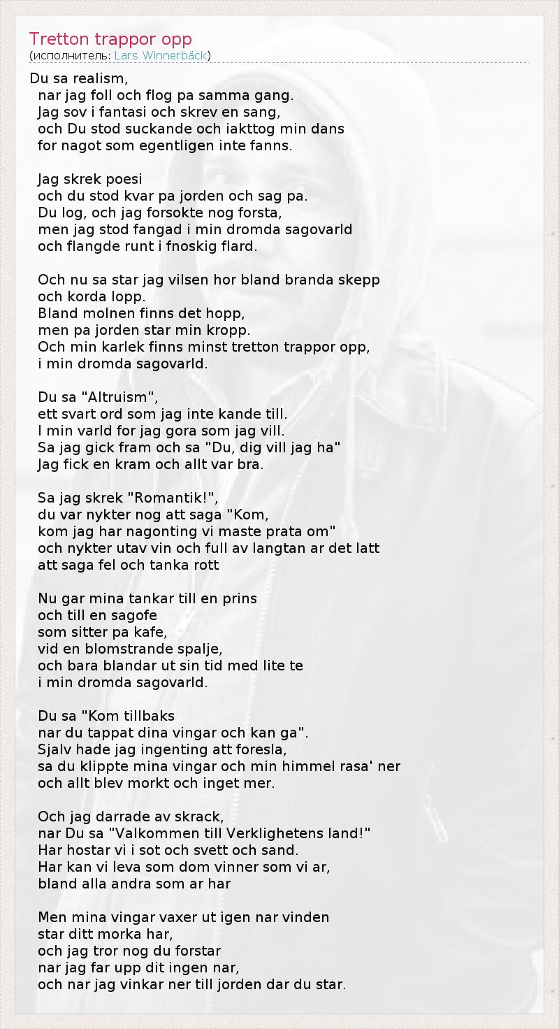 Это интересно:Lars Winnerbäck — один из самых популярных шведских singers/songwriters последней декады. Оттолкнувшись от звука поп-фолка, Ларс приблизился року поздних 90-х. В своей самой недавней работе Ларс снова вернулся к акустическому звучанию. Родившись в городе Linköping, Ларс уехал в Стокгольм, где и достиг успеха в музыкальной карьере. Оба города часто отражаются в текстах его песен.