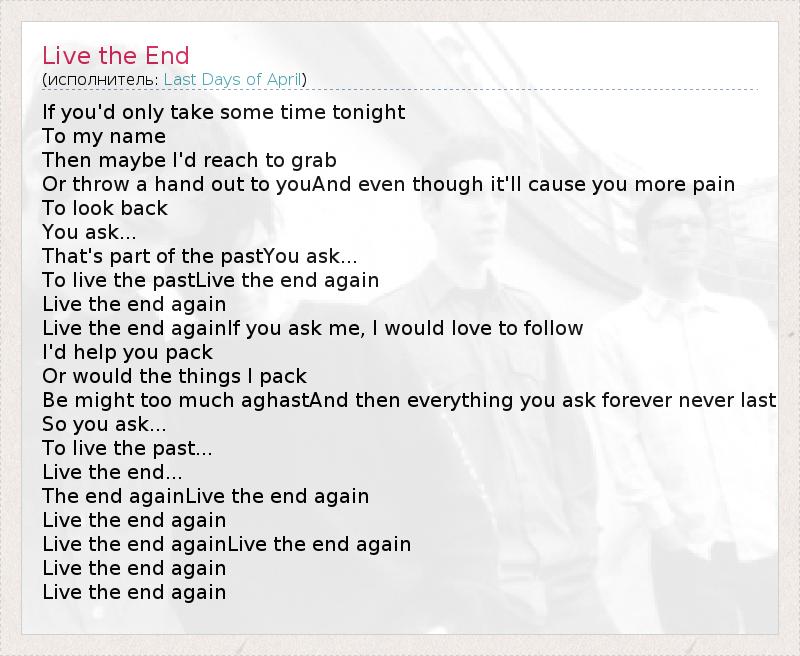 If you'd only take some time tonight To my name Then maybe I'd reach to grab Or throw a hand out to youAnd even though it'll cause you more pain To look back You ask... That's part of the pastYou ask... To live the pastLive the end again Live the end again Live the end againIf you ask me, I would love to follow I'd help you pack Or would the things I pack Be might too much aghastAnd then everything you ask forever never last So you ask... To live the past... Live the end... The end againLive the end again Live the end again Live the end againLive the end again Live the end again Live the end again