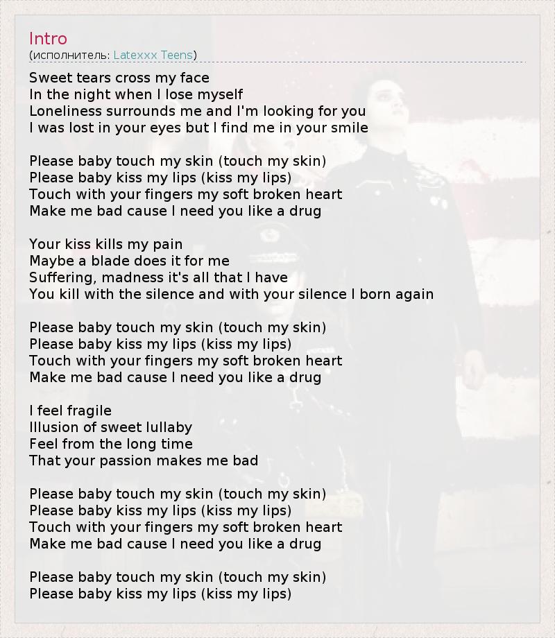Сладкие слёзы стекают по моему лицу Ночью, когда я теряю себя, Одиночество окружает меня, и я ищу тебя, Я потерялся в твоих глазах, но нахожу себя в твоей улыбке Пожалуйста, детка, коснись моей кожи, (коснись моей кожи) Пожалуйста, детка, поцелуй меня в губы, (поцелуй меня в губы) Коснись пальцами моего мягкого, разбитого сердца, Сделай меня плохим, ведь я нуждаюсь в тебе, как в наркотике Твой поцелуй утоляет мою боль, Возможно, лезвие делает это для меня, Страдание, безумие - это всё, что у меня есть, Ты убиваешь молчанием, но в твоём молчании я рождаюсь снова Пожалуйста, детка, коснись моей кожи, (коснись моей кожи) Пожалуйста, детка, поцелуй меня в губы, (поцелуй меня в губы) Коснись пальцами моего мягкого, разбитого сердца, Сделай меня плохим, ведь я нуждаюсь в тебе, как в наркотике Я чувствую хрупкую Иллюзию милой колыбельной, Чувствую с давних пор, Что твоя страсть делает меня плохим Пожалуйста, детка, коснись моей кожи, (коснись моей кожи) Пожалуйста, детка, поцелуй меня в губы, (поцелуй меня в губы) Коснись пальцами моего мягкого, разбитого сердца, Сделай меня плохим, ведь я нуждаюсь в тебе, как в наркотике Пожалуйста, детка, коснись моей кожи, (коснись моей кожи) Пожалуйста, детка, поцелуй меня в губы, (поцелуй меня в губы)
