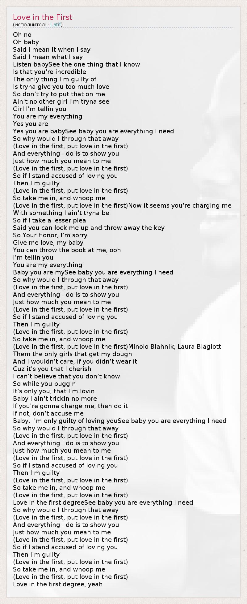 Oh no Oh baby Said I mean it when I say Said I mean what I say Listen babySee the one thing that I know Is that you're incredible The only thing I'm guilty of Is tryna give you too much love So don't try to put that on me Ain't no other girl I'm tryna see Girl I'm tellin you You are my everything Yes you are Yes you are babySee baby you are everything I need So why would I through that away (Love in the first, put love in the first) And everything I do is to show you Just how much you mean to me (Love in the first, put love in the first) So if I stand accused of loving you Then I'm guilty (Love in the first, put love in the first) So take me in, and whoop me (Love in the first, put love in the first)Now it seems you're charging me With something I ain't tryna be So if I take a lesser plea Said you can lock me up and throw away the key So Your Honor, I'm sorry Give me love, my baby You can throw the book at me, ooh I'm tellin you You are my everything Baby you are mySee baby you are everything I need So why would I through that away (Love in the first, put love in the first) And everything I do is to show you Just how much you mean to me (Love in the first, put love in the first) So if I stand accused of loving you Then I'm guilty (Love in the first, put love in the first) So take me in, and whoop me (Love in the first, put love in the first)Minolo Blahnik, Laura Biagiotti Them the only girls that get my dough And I wouldn't care, if you didn't wear it Cuz it's you that I cherish I can't believe that you don't know So while you buggin It's only you, that I'm lovin Baby I ain't trickin no more If you're gonna charge me, then do it If not, don't accuse me Baby, I'm only guilty of loving youSee baby you are everything I need So why would I through that away (Love in the first, put love in the first) And everything I do is to show you Just how much you mean to me (Love in the first, put love in the first) So if I stand accused of loving you Then I'm guilty (Love in the first, put love in the first) So take me in, and whoop me (Love in the first, put love in the first) Love in the first degreeSee baby you are everything I need So why would I through that away (Love in the first, put love in the first) And everything I do is to show you Just how much you mean to me (Love in the first, put love in the first) So if I stand accused of loving you Then I'm guilty (Love in the first, put love in the first) So take me in, and whoop me (Love in the first, put love in the first) Love in the first degree, yeah