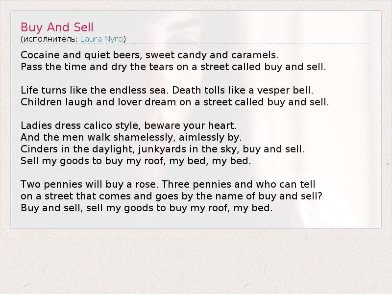 Cocaine and quiet beers, sweet candy and caramels. Pass the time and dry the tears on a street called buy and sell. Life turns like the endless sea. Death tolls like a vesper bell. Children laugh and lover dream on a street called buy and sell. Ladies dress calico style, beware your heart. And the men walk shamelessly, aimlessly by. Cinders in the daylight, junkyards in the sky, buy and sell. Sell my goods to buy my roof, my bed, my bed. Two pennies will buy a rose. Three pennies and who can tell on a street that comes and goes by the name of buy and sell? Buy and sell, sell my goods to buy my roof, my bed.