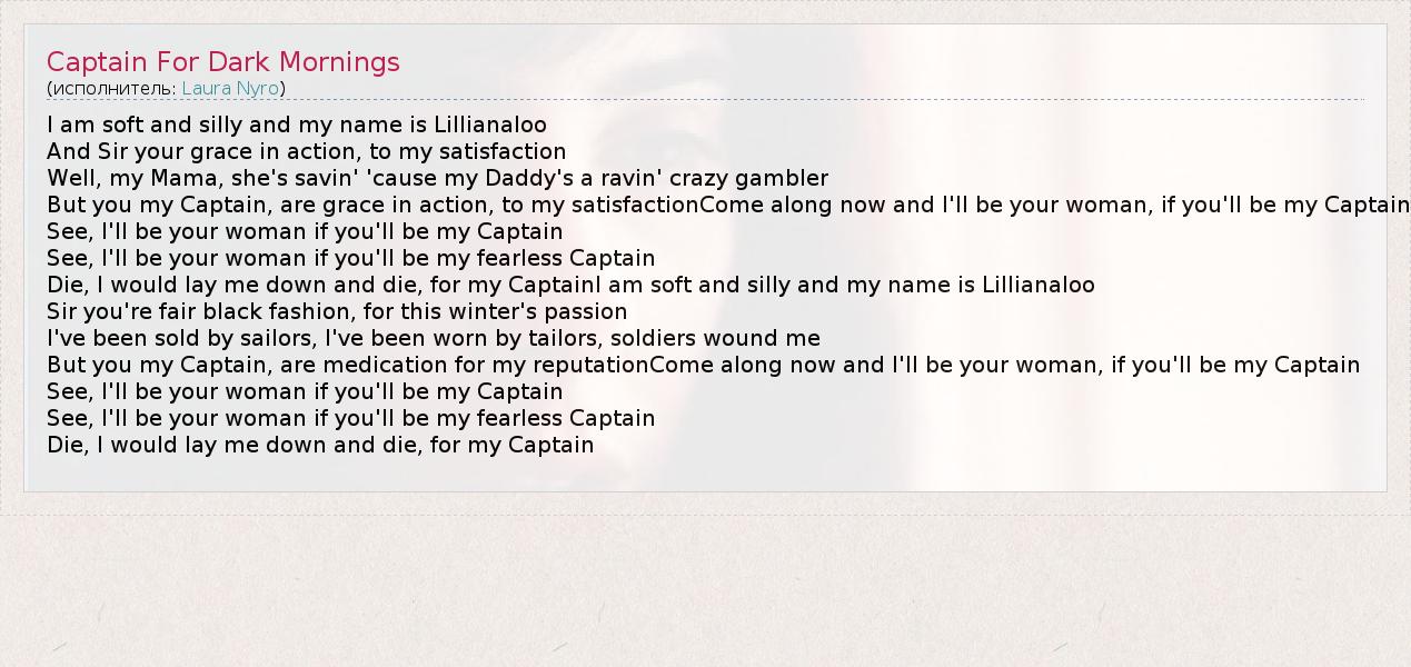 I am soft and silly and my name is Lillianaloo And Sir your grace in action, to my satisfaction Well, my Mama, she's savin' 'cause my Daddy's a ravin' crazy gambler But you my Captain, are grace in action, to my satisfactionCome along now and I'll be your woman, if you'll be my Captain See, I'll be your woman if you'll be my Captain See, I'll be your woman if you'll be my fearless Captain Die, I would lay me down and die, for my CaptainI am soft and silly and my name is Lillianaloo Sir you're fair black fashion, for this winter's passion I've been sold by sailors, I've been worn by tailors, soldiers wound me But you my Captain, are medication for my reputationCome along now and I'll be your woman, if you'll be my Captain See, I'll be your woman if you'll be my Captain See, I'll be your woman if you'll be my fearless Captain Die, I would lay me down and die, for my Captain