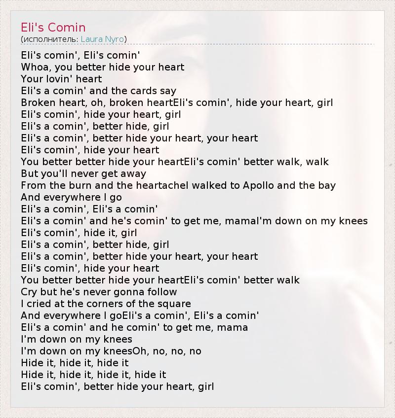 Eli's comin', Eli's comin' Whoa, you better hide your heart Your lovin' heart Eli's a comin' and the cards say Broken heart, oh, broken heartEli's comin', hide your heart, girl Eli's comin', hide your heart, girl Eli's a comin', better hide, girl Eli's a comin', better hide your heart, your heart Eli's comin', hide your heart You better better hide your heartEli's comin' better walk, walk But you'll never get away From the burn and the heartacheI walked to Apollo and the bay And everywhere I go Eli's a comin', Eli's a comin' Eli's a comin' and he's comin' to get me, mamaI'm down on my knees Eli's comin', hide it, girl Eli's a comin', better hide, girl Eli's a comin', better hide your heart, your heart Eli's comin', hide your heart You better better hide your heartEli's comin' better walk Cry but he's never gonna follow I cried at the corners of the square And everywhere I goEli's a comin', Eli's a comin' Eli's a comin' and he comin' to get me, mama I'm down on my knees I'm down on my kneesOh, no, no, no Hide it, hide it, hide it Hide it, hide it, hide it, hide it Eli's comin', better hide your heart, girl