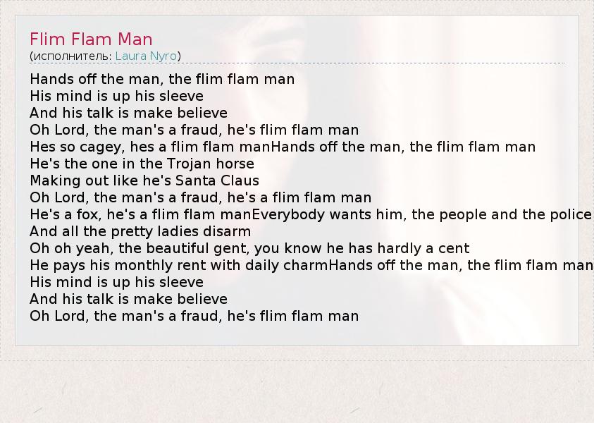 Hands off the man, the flim flam man His mind is up his sleeve And his talk is make believe Oh Lord, the man's a fraud, he's flim flam man Hes so cagey, hes a flim flam manHands off the man, the flim flam man He's the one in the Trojan horse Making out like he's Santa Claus Oh Lord, the man's a fraud, he's a flim flam man He's a fox, he's a flim flam manEverybody wants him, the people and the police And all the pretty ladies disarm Oh oh yeah, the beautiful gent, you know he has hardly a cent He pays his monthly rent with daily charmHands off the man, the flim flam man His mind is up his sleeve And his talk is make believe Oh Lord, the man's a fraud, he's flim flam man