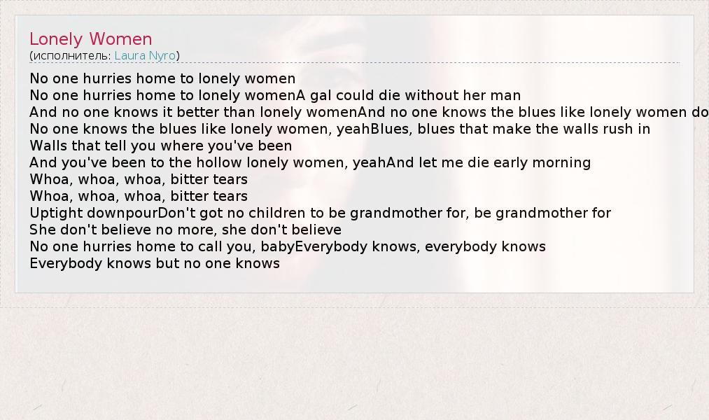 No one hurries home to lonely women No one hurries home to lonely womenA gal could die without her man And no one knows it better than lonely womenAnd no one knows the blues like lonely women do No one knows the blues like lonely women, yeahBlues, blues that make the walls rush in Walls that tell you where you've been And you've been to the hollow lonely women, yeahAnd let me die early morning Whoa, whoa, whoa, bitter tears Whoa, whoa, whoa, bitter tears Uptight downpourDon't got no children to be grandmother for, be grandmother for She don't believe no more, she don't believe No one hurries home to call you, babyEverybody knows, everybody knows Everybody knows but no one knows