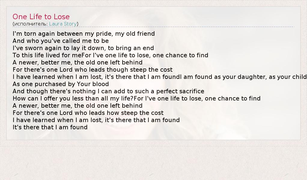 To this life lived for meFor I've one life to lose, one chance to find