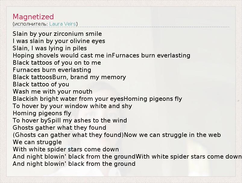 Slain by your zirconium smile I was slain by your olivine eyes Slain, I was lying in piles Hoping shovels would cast me inFurnaces burn everlasting Black tattoos of you on to me Furnaces burn everlasting Black tattoosBurn, brand my memory Black tattoo of you Wash me with your mouth Blackish bright water from your eyesHoming pigeons fly To hover by your window white and shy Homing pigeons fly To hover bySpill my ashes to the wind Ghosts gather what they found (Ghosts can gather what they found)Now we can struggle in the web We can struggle With white spider stars come down And night blowin' black from the groundWith white spider stars come down And night blowin' black from the ground