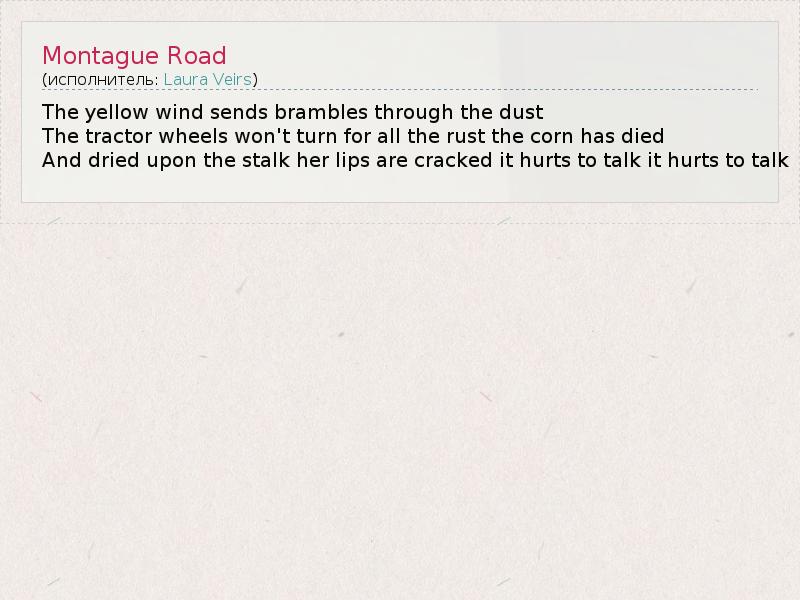 The yellow wind sends brambles through the dust The tractor wheels won't turn for all the rust the corn has died And dried upon the stalk her lips are cracked it hurts to talk it hurts to talk