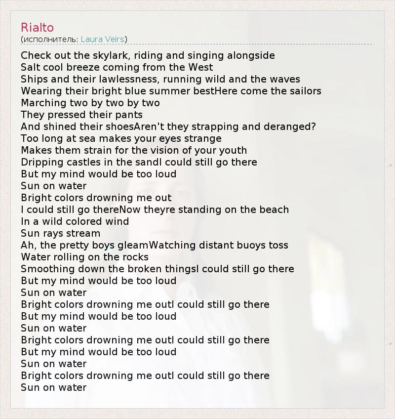 Check out the skylark, riding and singing alongside Salt cool breeze coming from the West Ships and their lawlessness, running wild and the waves Wearing their bright blue summer bestHere come the sailors Marching two by two by two They pressed their pants And shined their shoesAren't they strapping and deranged? Too long at sea makes your eyes strange Makes them strain for the vision of your youth Dripping castles in the sandI could still go there But my mind would be too loud Sun on water Bright colors drowning me out I could still go thereNow theyre standing on the beach In a wild colored wind Sun rays stream Ah, the pretty boys gleamWatching distant buoys toss Water rolling on the rocks Smoothing down the broken thingsI could still go there But my mind would be too loud Sun on water Bright colors drowning me outI could still go there But my mind would be too loud Sun on water Bright colors drowning me outI could still go there But my mind would be too loud Sun on water Bright colors drowning me outI could still go there Sun on water