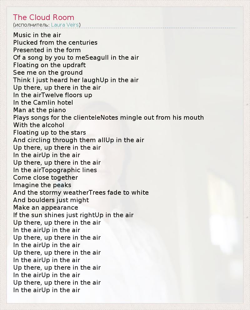 Music in the air Plucked from the centuries Presented in the form Of a song by you to meSeagull in the air Floating on the updraft See me on the ground Think I just heard her laughUp in the air Up there, up there in the air In the airTwelve floors up In the Camlin hotel Man at the piano Plays songs for the clienteleNotes mingle out from his mouth With the alcohol Floating up to the stars And circling through them allUp in the air Up there, up there in the air In the airUp in the air Up there, up there in the air In the airTopographic lines Come close together Imagine the peaks And the stormy weatherTrees fade to white And boulders just might Make an appearance If the sun shines just rightUp in the air Up there, up there in the air In the airUp in the air Up there, up there in the air In the airUp in the air Up there, up there in the air In the airUp in the air Up there, up there in the air In the airUp in the air Up there, up there in the air In the airUp in the air