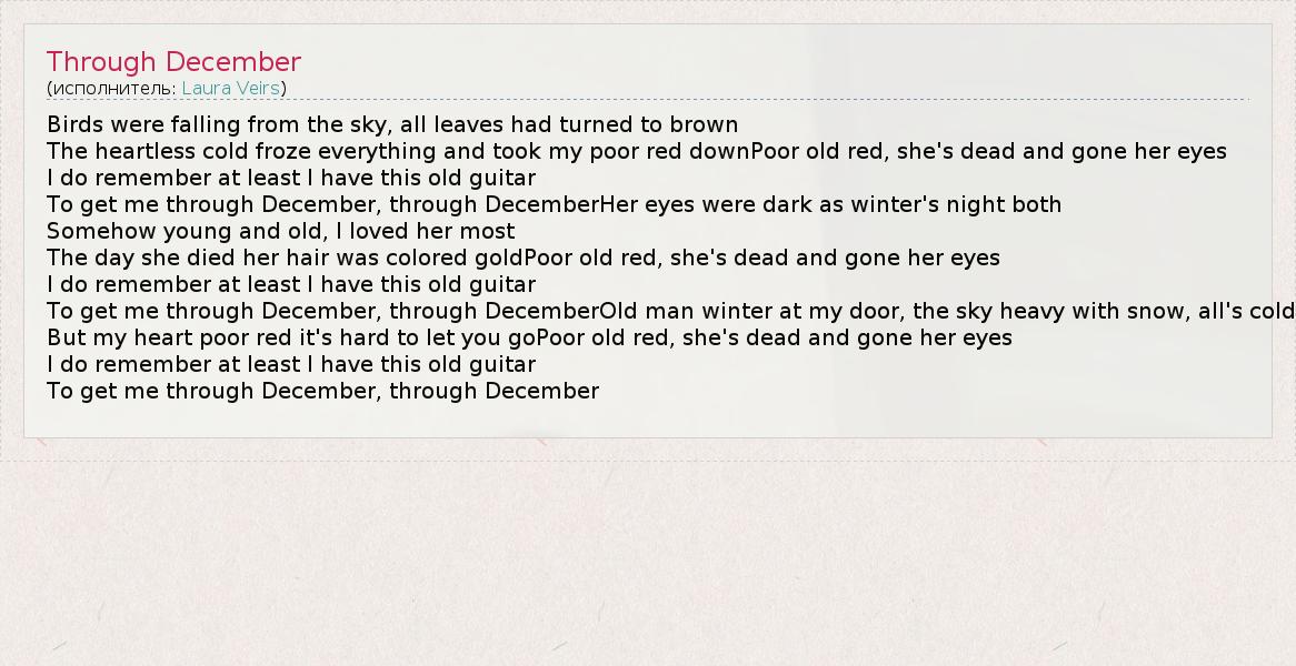Birds were falling from the sky, all leaves had turned to brown The heartless cold froze everything and took my poor red downPoor old red, she's dead and gone her eyes I do remember at least I have this old guitar To get me through December, through DecemberHer eyes were dark as winter's night both Somehow young and old, I loved her most The day she died her hair was colored goldPoor old red, she's dead and gone her eyes I do remember at least I have this old guitar To get me through December, through DecemberOld man winter at my door, the sky heavy with snow, all's cold But my heart poor red it's hard to let you goPoor old red, she's dead and gone her eyes I do remember at least I have this old guitar To get me through December, through December