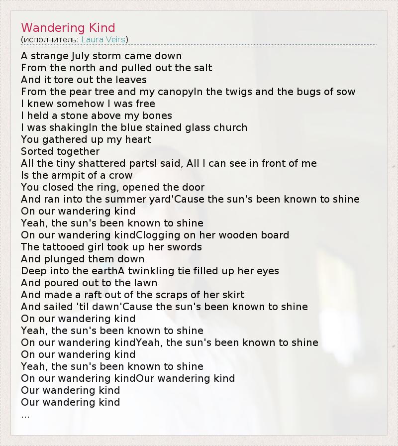 A strange July storm came down From the north and pulled out the salt And it tore out the leaves From the pear tree and my canopyIn the twigs and the bugs of sow I knew somehow I was free I held a stone above my bones I was shakingIn the blue stained glass church You gathered up my heart Sorted together All the tiny shattered partsI said, All I can see in front of me Is the armpit of a crow You closed the ring, opened the door And ran into the summer yard'Cause the sun's been known to shine On our wandering kind Yeah, the sun's been known to shine On our wandering kindClogging on her wooden board The tattooed girl took up her swords And plunged them down Deep into the earthA twinkling tie filled up her eyes And poured out to the lawn And made a raft out of the scraps of her skirt And sailed 'til dawn'Cause the sun's been known to shine On our wandering kind Yeah, the sun's been known to shine On our wandering kindYeah, the sun's been known to shine On our wandering kind Yeah, the sun's been known to shine On our wandering kindOur wandering kind Our wandering kind Our wandering kind ...