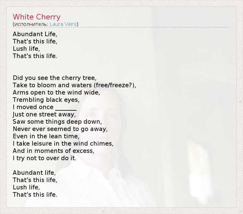 Abundant Life, That's this life, Lush life, That's this life. Did you see the cherry tree, Take to bloom and waters (free/freeze?), Arms open to the wind wide, Trembling black eyes, I moved once _______ Just one street away, Saw some things deep down, Never ever seemed to go away, Even in the lean time, I take leisure in the wind chimes, And in moments of excess, I try not to over do it. Abundant life, That's this life, Lush life, That's this life.