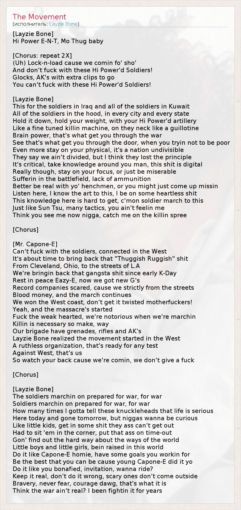 [Layzie Bone] Hi Power E-N-T, Mo Thug baby [Chorus: repeat 2X] (Uh) Lock-n-load cause we comin fo' sho' And don't fuck with these Hi Power'd Soldiers! Glocks, AK's with extra clips to go You can't fuck with these Hi Power'd Soldiers! [Layzie Bone] This for the soldiers in Iraq and all of the soldiers in Kuwait All of the soldiers in the hood, in every city and every state Hold it down, hold your weight, with your Hi Power'd artillery Like a fine tuned killin machine, on they neck like a guillotine Brain power, that's what get you through the war See that's what get you through the door, when you tryin not to be poor Even more stay on your physical, it's a nation undivisible They say we ain't divided, but I think they lost the principle It's critical, take knowledge around you man, this shit is digital Really though, stay on your focus, or just be miserable Sufferin in the battlefield, lack of ammunition Better be real with yo' henchmen, or you might just come up missin Listen here, I know the art to this, I be on some heartless shit This knowledge here is hard to get, c'mon soldier march to this Just like Sun Tsu, many tactics, you ain't feelin me Think you see me now nigga, catch me on the killin spree [Chorus] [Mr. Capone-E] Can't fuck with the soldiers, connected in the West It's about time to bring back that "Thuggish Ruggish" shit From Cleveland, Ohio, to the streets of L.A We're bringin back that gangsta shit since early K-Day Rest in peace Eazy-E, now we got new G's Record companies scared, cause we strictly from the streets Blood money, and the march continues We won the West coast, don't get it twisted motherfuckers! Yeah, and the massacre's started Fuck the weak hearted, we're notorious when we're marchin Killin is necessary so make, way Our brigade have grenades, rifles and AK's Layzie Bone realized the movement started in the West A ruthless organization, that's ready for any test Against West, that's us So watch your back cause we're comin, we don't give a fuck [Chorus] [Layzie Bone] The soldiers marchin on prepared for war, for war Soldiers marchin on prepared for war, for war How many times I gotta tell these knuckleheads that life is serious Here today and gone tomorrow, but niggas wanna be curious Like little kids, get in some shit they ass can't get out Had to sit 'em in the corner, put that ass on time-out Gon' find out the hard way about the ways of the world Little boys and little girls, bein raised in this world Do it like Capone-E homie, have some goals you workin for Be the best that you can be cause young Capone-E did it yo Do it like you bonafied, invitation, wanna ride? Keep it real, don't do it wrong, scary ones don't come outside Bravery, never fear, courage dawg, that's what it is Think the war ain't real? I been fightin it for years