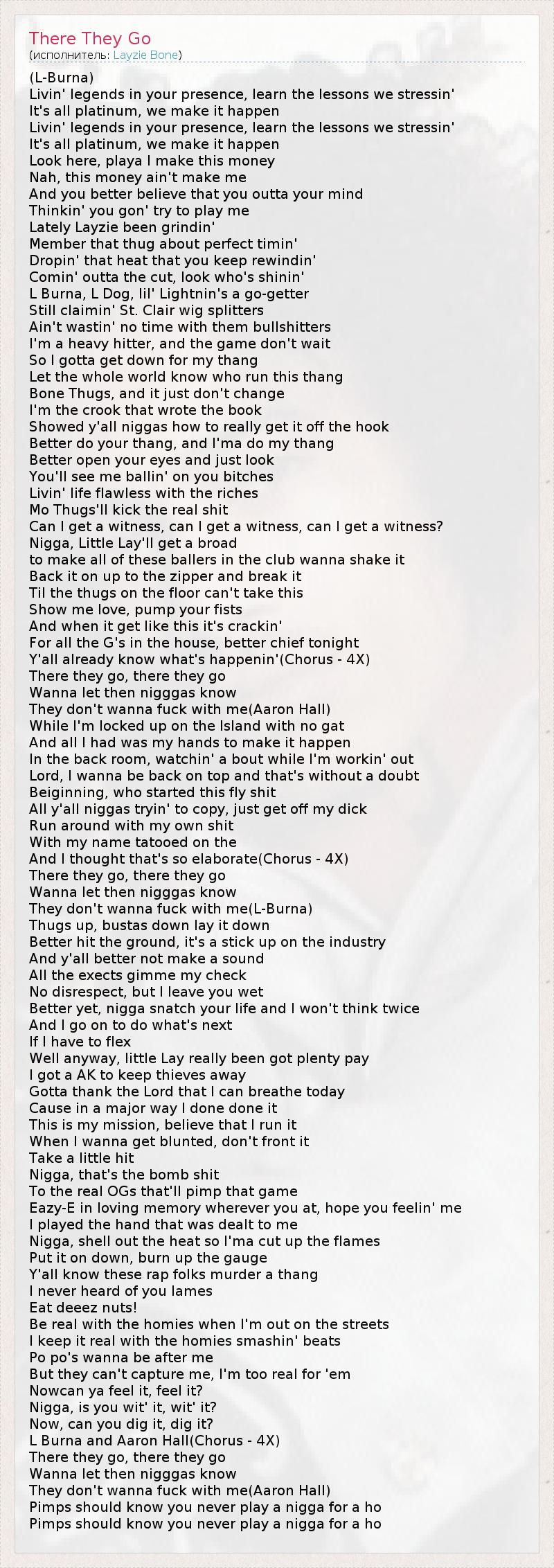 (L-Burna) Livin' legends in your presence, learn the lessons we stressin' It's all platinum, we make it happen Livin' legends in your presence, learn the lessons we stressin' It's all platinum, we make it happen Look here, playa I make this money Nah, this money ain't make me And you better believe that you outta your mind Thinkin' you gon' try to play me Lately Layzie been grindin' Member that thug about perfect timin' Dropin' that heat that you keep rewindin' Comin' outta the cut, look who's shinin' L Burna, L Dog, lil' Lightnin's a go-getter Still claimin' St. Clair wig splitters Ain't wastin' no time with them bullshitters I'm a heavy hitter, and the game don't wait So I gotta get down for my thang Let the whole world know who run this thang Bone Thugs, and it just don't change I'm the crook that wrote the book Showed y'all niggas how to really get it off the hook Better do your thang, and I'ma do my thang Better open your eyes and just look You'll see me ballin' on you bitches Livin' life flawless with the riches Mo Thugs'll kick the real shit Can I get a witness, can I get a witness, can I get a witness? Nigga, Little Lay'll get a broad to make all of these ballers in the club wanna shake it Back it on up to the zipper and break it Til the thugs on the floor can't take this Show me love, pump your fists And when it get like this it's crackin' For all the G's in the house, better chief tonight Y'all already know what's happenin'(Chorus - 4X) There they go, there they go Wanna let then nigggas know They don't wanna fuck with me(Aaron Hall) While I'm locked up on the Island with no gat And all I had was my hands to make it happen In the back room, watchin' a bout while I'm workin' out Lord, I wanna be back on top and that's without a doubt Beiginning, who started this fly shit All y'all niggas tryin' to copy, just get off my dick Run around with my own shit With my name tatooed on the And I thought that's so elaborate(Chorus - 4X) There they go, there they go Wanna let then nigggas know They don't wanna fuck with me(L-Burna) Thugs up, bustas down lay it down Better hit the ground, it's a stick up on the industry And y'all better not make a sound All the exects gimme my check No disrespect, but I leave you wet Better yet, nigga snatch your life and I won't think twice And I go on to do what's next If I have to flex Well anyway, little Lay really been got plenty pay I got a AK to keep thieves away Gotta thank the Lord that I can breathe today Cause in a major way I done done it This is my mission, believe that I run it When I wanna get blunted, don't front it Take a little hit Nigga, that's the bomb shit To the real OGs that'll pimp that game Eazy-E in loving memory wherever you at, hope you feelin' me I played the hand that was dealt to me Nigga, shell out the heat so I'ma cut up the flames Put it on down, burn up the gauge Y'all know these rap folks murder a thang I never heard of you lames Eat deeez nuts! Be real with the homies when I'm out on the streets I keep it real with the homies smashin' beats Po po's wanna be after me But they can't capture me, I'm too real for 'em Nowcan ya feel it, feel it? Nigga, is you wit' it, wit' it? Now, can you dig it, dig it? L Burna and Aaron Hall(Chorus - 4X) There they go, there they go Wanna let then nigggas know They don't wanna fuck with me(Aaron Hall) Pimps should know you never play a nigga for a ho Pimps should know you never play a nigga for a ho