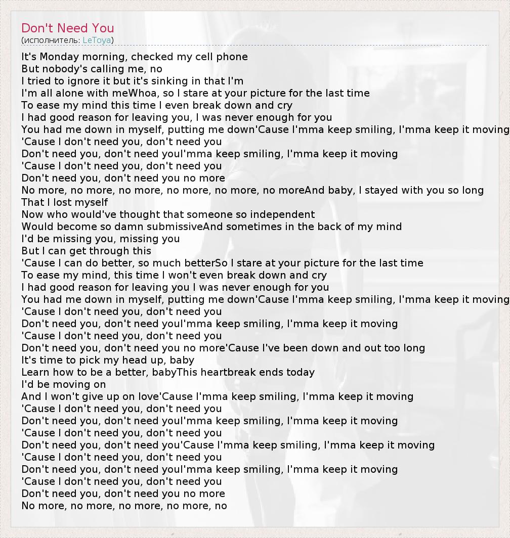 Don't need you, don't need youI'mma keep smiling, I'mma keep it moving