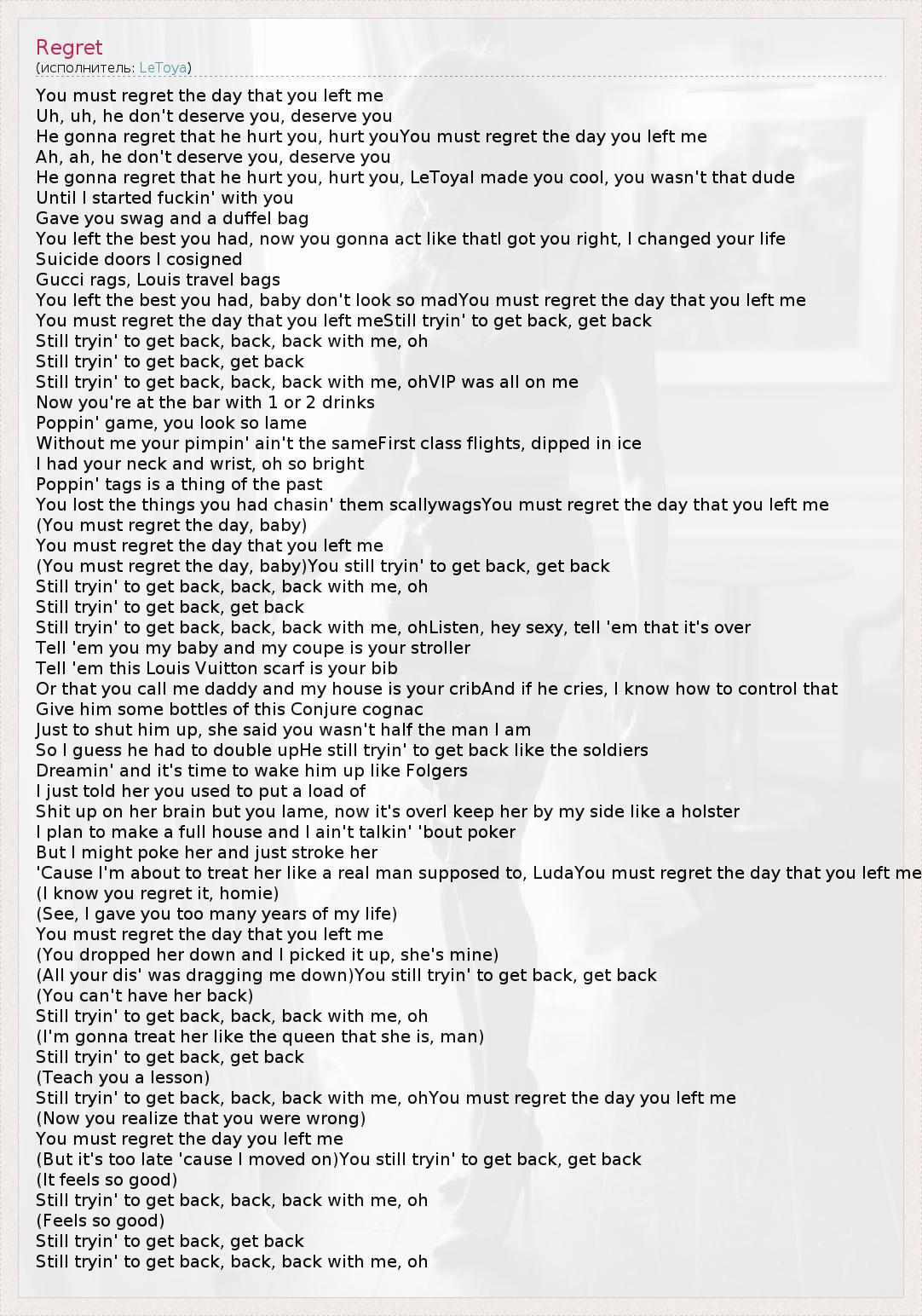 You must regret the day that you left meStill tryin' to get back, get back