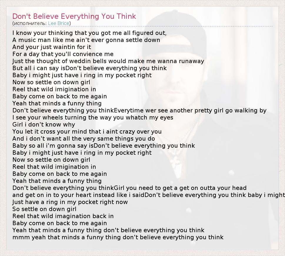 I know your thinking that you got me all figured out, A music man like me ain't ever gonna settle down And your just waintin for it For a day that you'll convience me Just the thought of weddin bells would make me wanna runaway But all i can say isDon't believe everything you think Baby i might just have i ring in my pocket right Now so settle on down girl Reel that wild imigination in Baby come on back to me again Yeah that minds a funny thing Don't believe everything you thinkEverytime wer see another pretty girl go walking by I see your wheels turning the way you whatch my eyes Girl i don't know why You let it cross your mind that i aint crazy over you And i don't want all the very same things you do Baby so all i'm gonna say isDon't believe everything you think Baby i might just have i ring in my pocket right Now so settle on down girl Reel that wild imigination in Baby come on back to me again Yeah that minds a funny thing Don't believe everything you thinkGirl you need to get a get on outta your head and get on in to your heart instead like i saidDon't believe everything you think baby i might Just have a ring in my pocket right now So settle on down girl Reel that wild imagination back in Baby come on back to me again Yeah that minds a funny thing don't believe everything you think mmm yeah that minds a funny thing don't believe everything you think