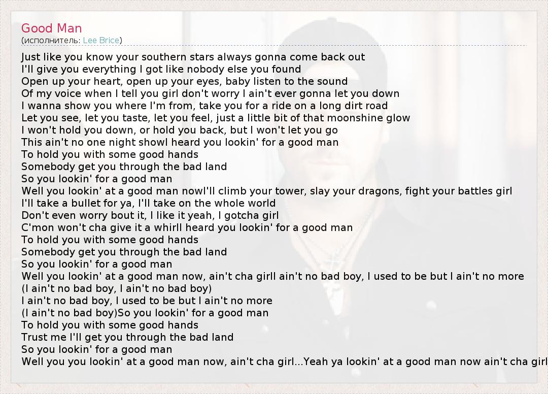 Well you you lookin' at a good man now, ain't cha girl...Yeah ya lookin' at a good man now ain't cha girl