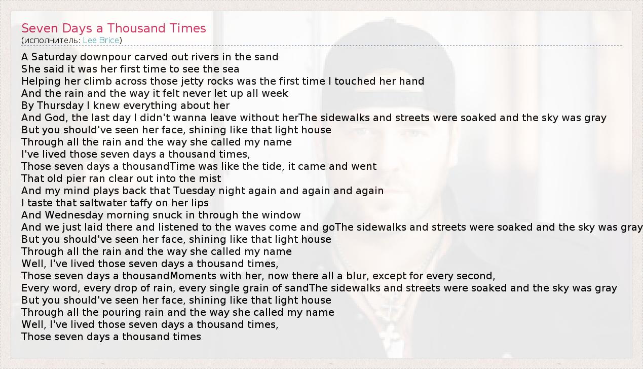 A Saturday downpour carved out rivers in the sand She said it was her first time to see the sea Helping her climb across those jetty rocks was the first time I touched her hand And the rain and the way it felt never let up all week By Thursday I knew everything about her And God, the last day I didn't wanna leave without herThe sidewalks and streets were soaked and the sky was gray But you should've seen her face, shining like that light house Through all the rain and the way she called my name I've lived those seven days a thousand times, Those seven days a thousandTime was like the tide, it came and went That old pier ran clear out into the mist And my mind plays back that Tuesday night again and again and again I taste that saltwater taffy on her lips And Wednesday morning snuck in through the window And we just laid there and listened to the waves come and goThe sidewalks and streets were soaked and the sky was gray But you should've seen her face, shining like that light house Through all the rain and the way she called my name Well, I've lived those seven days a thousand times, Those seven days a thousandMoments with her, now there all a blur, except for every second, Every word, every drop of rain, every single grain of sandThe sidewalks and streets were soaked and the sky was gray But you should've seen her face, shining like that light house Through all the pouring rain and the way she called my name Well, I've lived those seven days a thousand times, Those seven days a thousand times