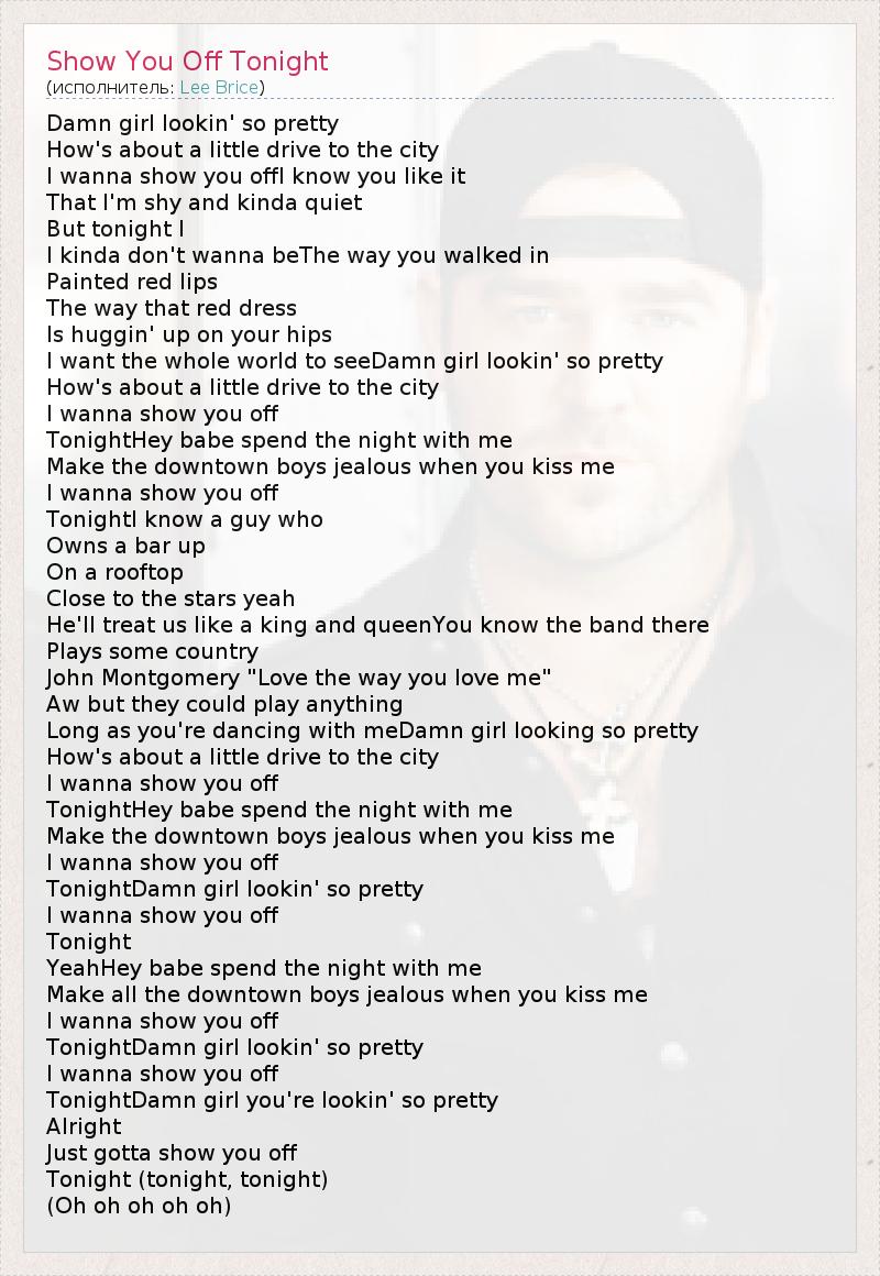 Damn girl lookin' so pretty How's about a little drive to the city I wanna show you offI know you like it That I'm shy and kinda quiet But tonight I I kinda don't wanna beThe way you walked in Painted red lips The way that red dress Is huggin' up on your hips I want the whole world to seeDamn girl lookin' so pretty How's about a little drive to the city I wanna show you off TonightHey babe spend the night with me Make the downtown boys jealous when you kiss me I wanna show you off TonightI know a guy who Owns a bar up On a rooftop Close to the stars yeah He'll treat us like a king and queenYou know the band there Plays some country John Montgomery "Love the way you love me" Aw but they could play anything Long as you're dancing with meDamn girl looking so pretty How's about a little drive to the city I wanna show you off TonightHey babe spend the night with me Make the downtown boys jealous when you kiss me I wanna show you off TonightDamn girl lookin' so pretty I wanna show you off Tonight YeahHey babe spend the night with me Make all the downtown boys jealous when you kiss me I wanna show you off TonightDamn girl lookin' so pretty I wanna show you off TonightDamn girl you're lookin' so pretty Alright Just gotta show you off Tonight (tonight, tonight) (Oh oh oh oh oh)