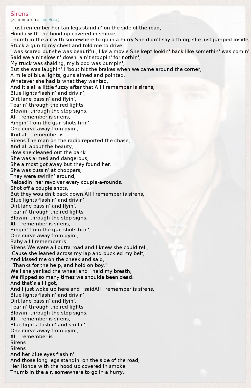 I just remember her tan legs standin' on the side of the road, Honda with the hood up covered in smoke, Thumb in the air with somewhere to go in a hurry.She didn't say a thing, she just jumped inside, Stuck a gun to my chest and told me to drive. I was scared but she was beautiful, like a movie.She kept lookin' back like somethin' was comin', Said we ain't slowin' down, ain't stoppin' for nothin', My truck was shaking, my blood was pumpin', But she was laughin'.I 'bout hit the brakes when we came around the corner, A mile of blue lights, guns aimed and pointed. Whatever she had is what they wanted, And it's all a little fuzzy after that.All I remember is sirens, Blue lights flashin' and drivin', Dirt lane passin' and flyin', Tearin' through the red lights, Blowin' through the stop signs. All I remember is sirens, Ringin' from the gun shots firin', One curve away from dyin', And all I remember is... Sirens.The man on the radio reported the chase, And all about the beauty, How she cleaned out the bank. She was armed and dangerous, She almost got away but they found her. She was cussin' at choppers, They were swirlin' around, Reloadin' her revolver every couple-a-rounds. Shot off a couple shots, But they wouldn't back down.All I remember is sirens, Blue lights flashin' and drivin', Dirt lane passin' and flyin', Tearin' through the red lights, Blowin' through the stop signs. All I remember is sirens, Ringin' from the gun shots firin', One curve away from dyin', Baby all I remember is... Sirens.We were all outta road and I knew she could tell, 'Cause she leaned across my lap and buckled my belt, And kissed me on the cheek and said, "Thanks for the help, and hold on boy." Well she yanked the wheel and I held my breath, We flipped so many times we shoulda been dead. And that's all I got, And I just woke up here and I saidAll I remember is sirens, Blue lights flashin' and drivin', Dirt lane passin' and flyin', Tearin' through the red lights, Blowin' through the stop signs. All I remember is sirens, Blue lights flashin' and smilin', One curve away from dyin', All I remember is... Sirens. Sirens. And her blue eyes flashin'. And those long legs standin' on the side of the road, Her Honda with the hood up covered in smoke, Thumb in the air, somewhere to go in a hurry.