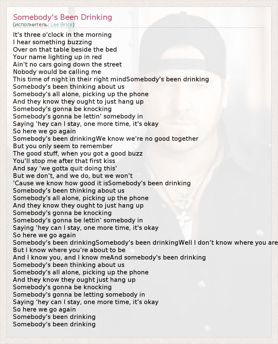 It's three o'clock in the morning I hear something buzzing Over on that table beside the bed Your name lighting up in red Ain't no cars going down the street Nobody would be calling me This time of night in their right mindSomebody's been drinking Somebody's been thinking about us Somebody's all alone, picking up the phone And they know they ought to just hang up Somebody's gonna be knocking Somebody's gonna be lettin' somebody in Saying 'hey can I stay, one more time, it's okay So here we go again Somebody's been drinkingWe know we're no good together But you only seem to remember The good stuff, when you got a good buzz You'll stop me after that first kiss And say 'we gotta quit doing this' But we don't, and we do, but we won't 'Cause we know how good it isSomebody's been drinking Somebody's been thinking about us Somebody's all alone, picking up the phone And they know they ought to just hang up Somebody's gonna be knocking Somebody's gonna be lettin' somebody in Saying 'hey can I stay, one more time, it's okay So here we go again Somebody's been drinkingSomebody's been drinkingWell I don't know where you are But I know where you're about to be And I know you, and I know meAnd somebody's been drinking Somebody's been thinking about us Somebody's all alone, picking up the phone And they know they ought just hang up Somebody's gonna be knocking Somebody's gonna be letting somebody in Saying 'hey can I stay, one more time, it's okay So here we go again Somebody's been drinking Somebody's been drinking