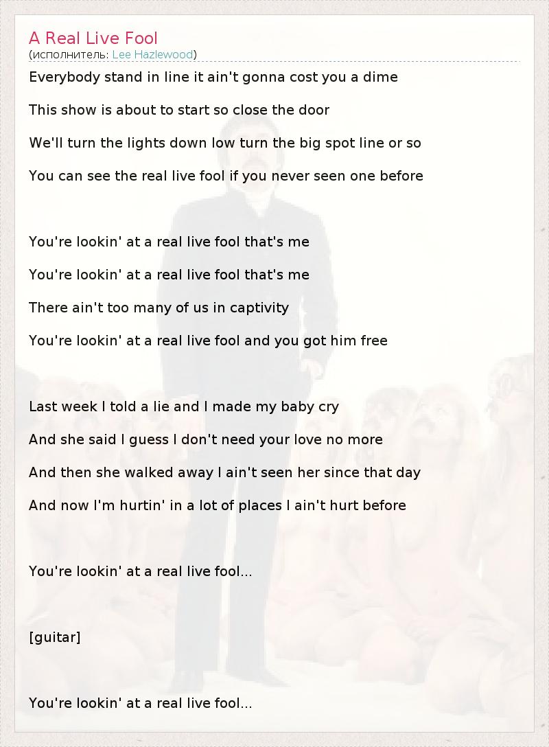 Everybody stand in line it ain't gonna cost you a dime This show is about to start so close the door We'll turn the lights down low turn the big spot line or so You can see the real live fool if you never seen one before You're lookin' at a real live fool that's me You're lookin' at a real live fool that's me There ain't too many of us in captivity You're lookin' at a real live fool and you got him free Last week I told a lie and I made my baby cry And she said I guess I don't need your love no more And then she walked away I ain't seen her since that day And now I'm hurtin' in a lot of places I ain't hurt before You're lookin' at a real live fool... [guitar] You're lookin' at a real live fool...