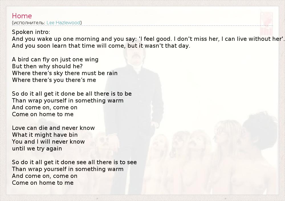 Spoken intro: And you wake up one morning and you say: 'I feel good. I don't miss her, I can live without her'. And you soon learn that time will come, but it wasn't that day. A bird can fly on just one wing But then why should he? Where there’s sky there must be rain Where there’s you there’s me So do it all get it done be all there is to be Than wrap yourself in something warm And come on, come on Come on home to me Love can die and never know What it might have bin You and I will never know until we try again So do it all get it done see all there is to see Than wrap yourself in something warm And come on, come on Come on home to me