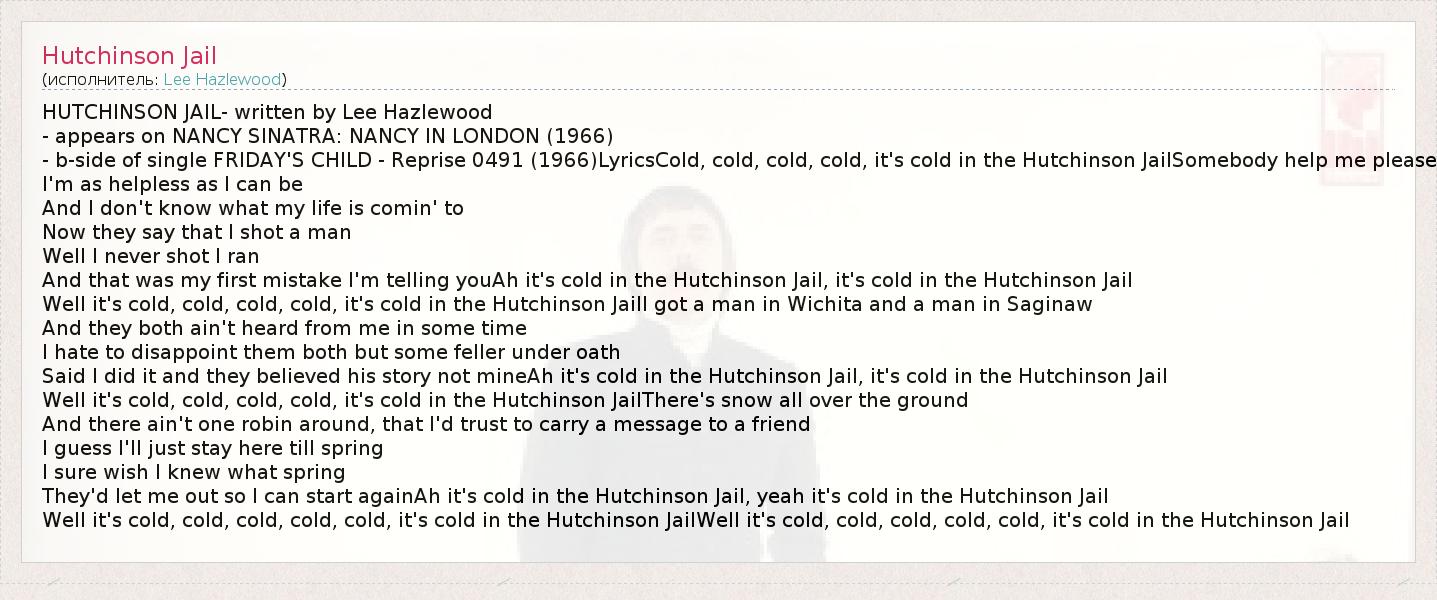 HUTCHINSON JAIL- written by Lee Hazlewood - appears on NANCY SINATRA: NANCY IN LONDON (1966) - b-side of single FRIDAY'S CHILD - Reprise 0491 (1966)LyricsCold, cold, cold, cold, it's cold in the Hutchinson JailSomebody help me please I'm as helpless as I can be And I don't know what my life is comin' to Now they say that I shot a man Well I never shot I ran And that was my first mistake I'm telling youAh it's cold in the Hutchinson Jail, it's cold in the Hutchinson Jail Well it's cold, cold, cold, cold, it's cold in the Hutchinson JailI got a man in Wichita and a man in Saginaw And they both ain't heard from me in some time I hate to disappoint them both but some feller under oath Said I did it and they believed his story not mineAh it's cold in the Hutchinson Jail, it's cold in the Hutchinson Jail Well it's cold, cold, cold, cold, it's cold in the Hutchinson JailThere's snow all over the ground And there ain't one robin around, that I'd trust to carry a message to a friend I guess I'll just stay here till spring I sure wish I knew what spring They'd let me out so I can start againAh it's cold in the Hutchinson Jail, yeah it's cold in the Hutchinson Jail Well it's cold, cold, cold, cold, cold, it's cold in the Hutchinson JailWell it's cold, cold, cold, cold, cold, it's cold in the Hutchinson Jail