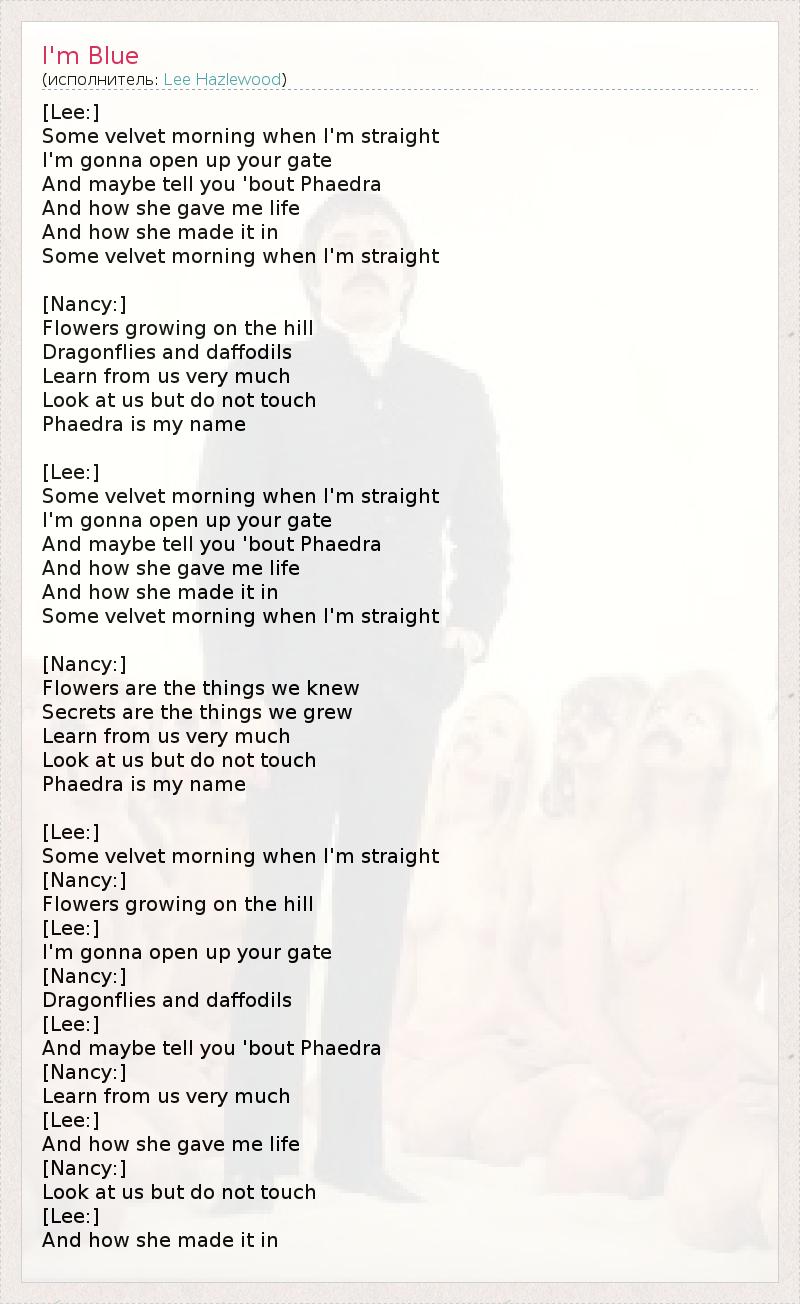Это интересно:Ли Хезлвуд (англ. Lee Hazlewood, 9.07.1929 — 4.08.2007) — американский музыкант, автор песен, певец, продюсер. Ли Хезлвуд можно назвать одним из «серых кардиналов» современной музыки. Он, частично в соавторстве с Нэнси Синатрой (дочерью Фрэнка Синатры), написал такие хиты, как «This Boots Are Made For Walking», «Something Stupid», «Summer Wine», «Some Velvet Morning», на которые существует большое множество кавер-версий(Ник Кейв, Einstürzende... продолжение