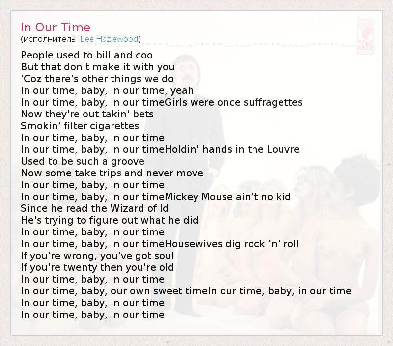 People used to bill and coo But that don't make it with you 'Coz there's other things we do In our time, baby, in our time, yeah In our time, baby, in our timeGirls were once suffragettes Now they're out takin' bets Smokin' filter cigarettes In our time, baby, in our time In our time, baby, in our timeHoldin' hands in the Louvre Used to be such a groove Now some take trips and never move In our time, baby, in our time In our time, baby, in our timeMickey Mouse ain't no kid Since he read the Wizard of Id He's trying to figure out what he did In our time, baby, in our time In our time, baby, in our timeHousewives dig rock 'n' roll If you're wrong, you've got soul If you're twenty then you're old In our time, baby, in our time In our time, baby, our own sweet timeIn our time, baby, in our time In our time, baby, in our time In our time, baby, in our time