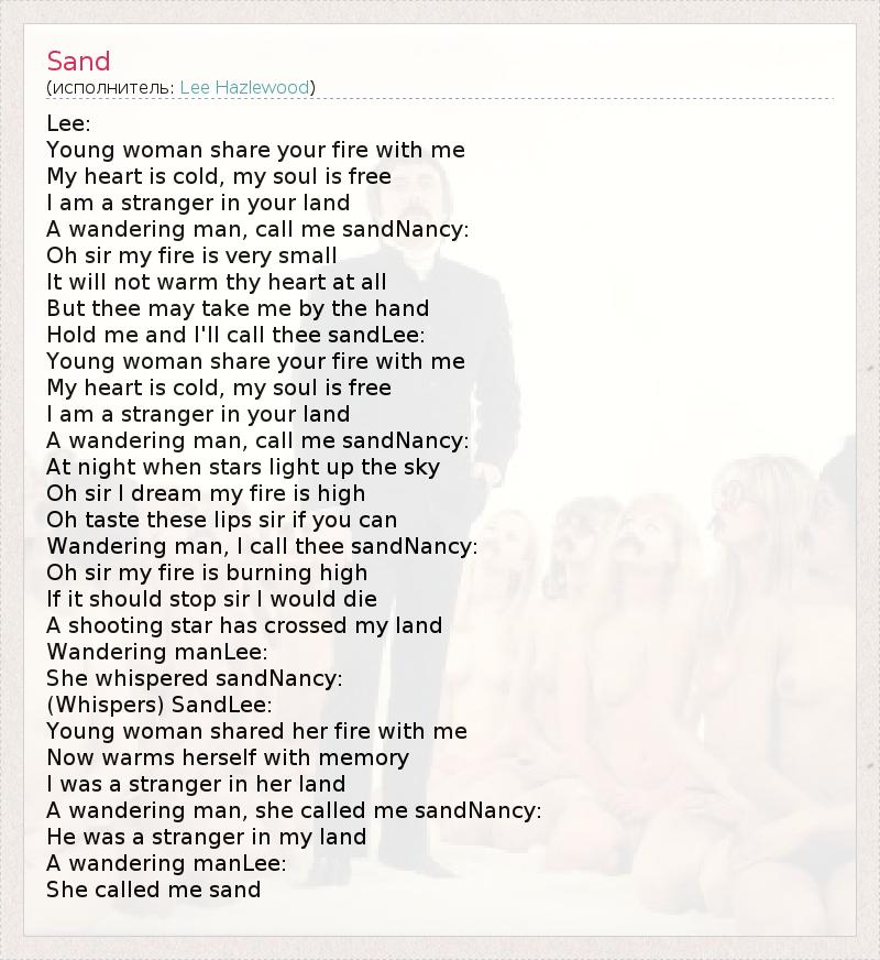 Это интересно:Ли Хезлвуд (англ. Lee Hazlewood, 9.07.1929 — 4.08.2007) — американский музыкант, автор песен, певец, продюсер. Ли Хезлвуд можно назвать одним из «серых кардиналов» современной музыки. Он, частично в соавторстве с Нэнси Синатрой (дочерью Фрэнка Синатры), написал такие хиты, как «This Boots Are Made For Walking», «Something Stupid», «Summer Wine», «Some Velvet Morning», на которые существует большое множество кавер-версий(Ник Кейв, Einstürzende... продолжение