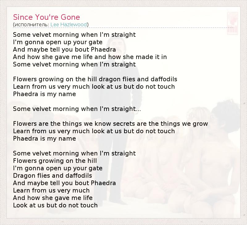 Some velvet morning when I'm straight I'm gonna open up your gate And maybe tell you bout Phaedra And how she gave me life and how she made it in Some velvet morning when I'm straight Flowers growing on the hill dragon flies and daffodils Learn from us very much look at us but do not touch Phaedra is my name Some velvet morning when I'm straight... Flowers are the things we know secrets are the things we grow Learn from us very much look at us but do not touch Phaedra is my name Some velvet morning when I'm straight Flowers growing on the hill I'm gonna open up your gate Dragon flies and daffodils And maybe tell you bout Phaedra Learn from us very much And how she gave me life Look at us but do not touch