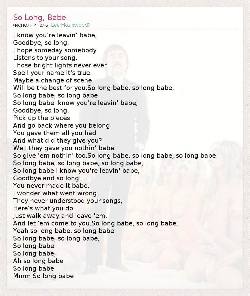 I know you're leavin' babe, Goodbye, so long. I hope someday somebody Listens to your song. Those bright lights never ever Spell your name it's true. Maybe a change of scene Will be the best for you.So long babe, so long babe, So long babe, so long babe So long babeI know you're leavin' babe, Goodbye, so long. Pick up the pieces And go back where you belong. You gave them all you had And what did they give you? Well they gave you nothin' babe So give 'em nothin' too.So long babe, so long babe, so long babe So long babe, so long babe, so long babe, So long babe.I know you're leavin' babe, Goodbye and so long. You never made it babe, I wonder what went wrong. They never understood your songs, Here's what you do Just walk away and leave 'em, And let 'em come to you.So long babe, so long babe, Yeah so long babe, so long babe So long babe, so long babe, So long babe So long babe, Ah so long babe So long babe Mmm So long babe