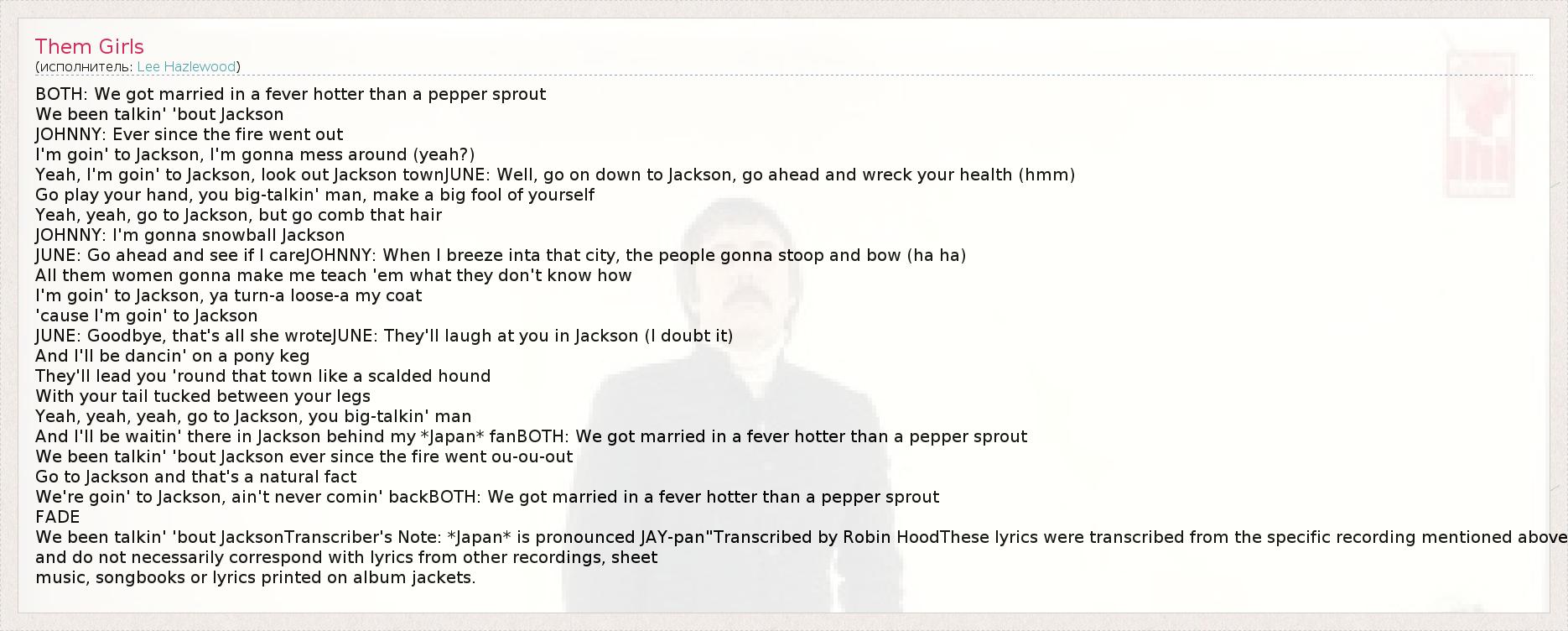 Это интересно:Ли Хезлвуд (англ. Lee Hazlewood, 9.07.1929 — 4.08.2007) — американский музыкант, автор песен, певец, продюсер. Ли Хезлвуд можно назвать одним из «серых кардиналов» современной музыки. Он, частично в соавторстве с Нэнси Синатрой (дочерью Фрэнка Синатры), написал такие хиты, как «This Boots Are Made For Walking», «Something Stupid», «Summer Wine», «Some Velvet Morning», на которые существует большое множество кавер-версий(Ник Кейв, Einstürzende... продолжение
