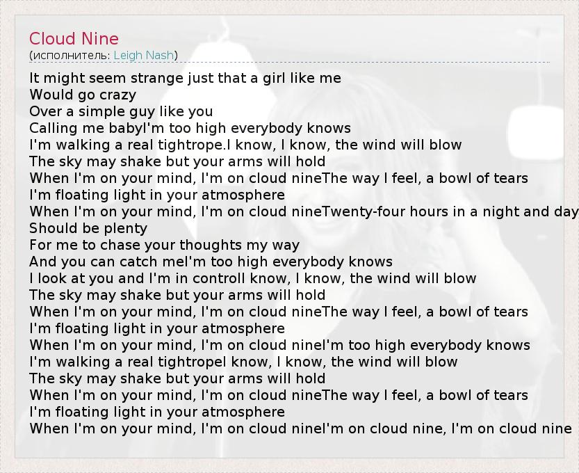 It might seem strange just that a girl like me Would go crazy Over a simple guy like you Calling me babyI'm too high everybody knows I'm walking a real tightrope.I know, I know, the wind will blow The sky may shake but your arms will hold When I'm on your mind, I'm on cloud nineThe way I feel, a bowl of tears I'm floating light in your atmosphere When I'm on your mind, I'm on cloud nineTwenty-four hours in a night and day Should be plenty For me to chase your thoughts my way And you can catch meI'm too high everybody knows I look at you and I'm in controlI know, I know, the wind will blow The sky may shake but your arms will hold When I'm on your mind, I'm on cloud nineThe way I feel, a bowl of tears I'm floating light in your atmosphere When I'm on your mind, I'm on cloud nineI'm too high everybody knows I'm walking a real tightropeI know, I know, the wind will blow The sky may shake but your arms will hold When I'm on your mind, I'm on cloud nineThe way I feel, a bowl of tears I'm floating light in your atmosphere When I'm on your mind, I'm on cloud nineI'm on cloud nine, I'm on cloud nine