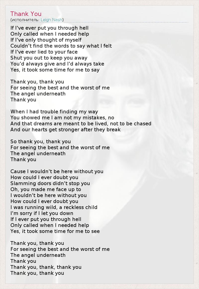 Если из-за меня ты попадал в ад, А я звонила тебе, только когда мне требовалась помощь, Как будто думала только о себе. Я не могла найти слов, чтобы описать свои чувства, Если бы я когда-нибудь соврала тебе в лицо, Заставила тебя держаться от меня подальше, Ты всегда отдаешь, а я всегда получаю, Да, мне понадобилось некоторое время, чтобы сказать - Спасибо, спасибо За то, что был со мной в горе и радости, Ты - ангел, живущий на земле Спасибо! Когда я пыталась найти свой путь, Ты показал мне, что я не результат своих собственных ошибок, И мечтами нужно жить, а не гоняться за ними, И наши сердца становятся только сильнее, после того, как они разобьются. Так спасибо, спасибо За то, что был со мной и в горе и в радости, Ты - ангел живущий на земле, Спасибо. Потому что без тебя меня бы здесь не было, Как я могла когда-либо в тебе сомневаться? Закрытые двери не остановили тебя, О, ты заставил меня поднять голову, Без тебя меня бы здесь не было, Как я могла когда - либо в тебе сомневаться? Я никогда не стояла на месте, вела себя словно беспокойный ребенок, Прости, если я обидела тебя, Если из-за меня ты проходил сквозь ад, Я звонила тебе только тогда, когда мне нужна была помощь, Да, мне потребовалось некоторое время, чтобы понять. Спасибо, спасибо За то, что был со мной в горе и радости, Ты - ангел, живущий на земле, Спасибо, Спасибо, спасибо, спасибо Спасибо, спасибо