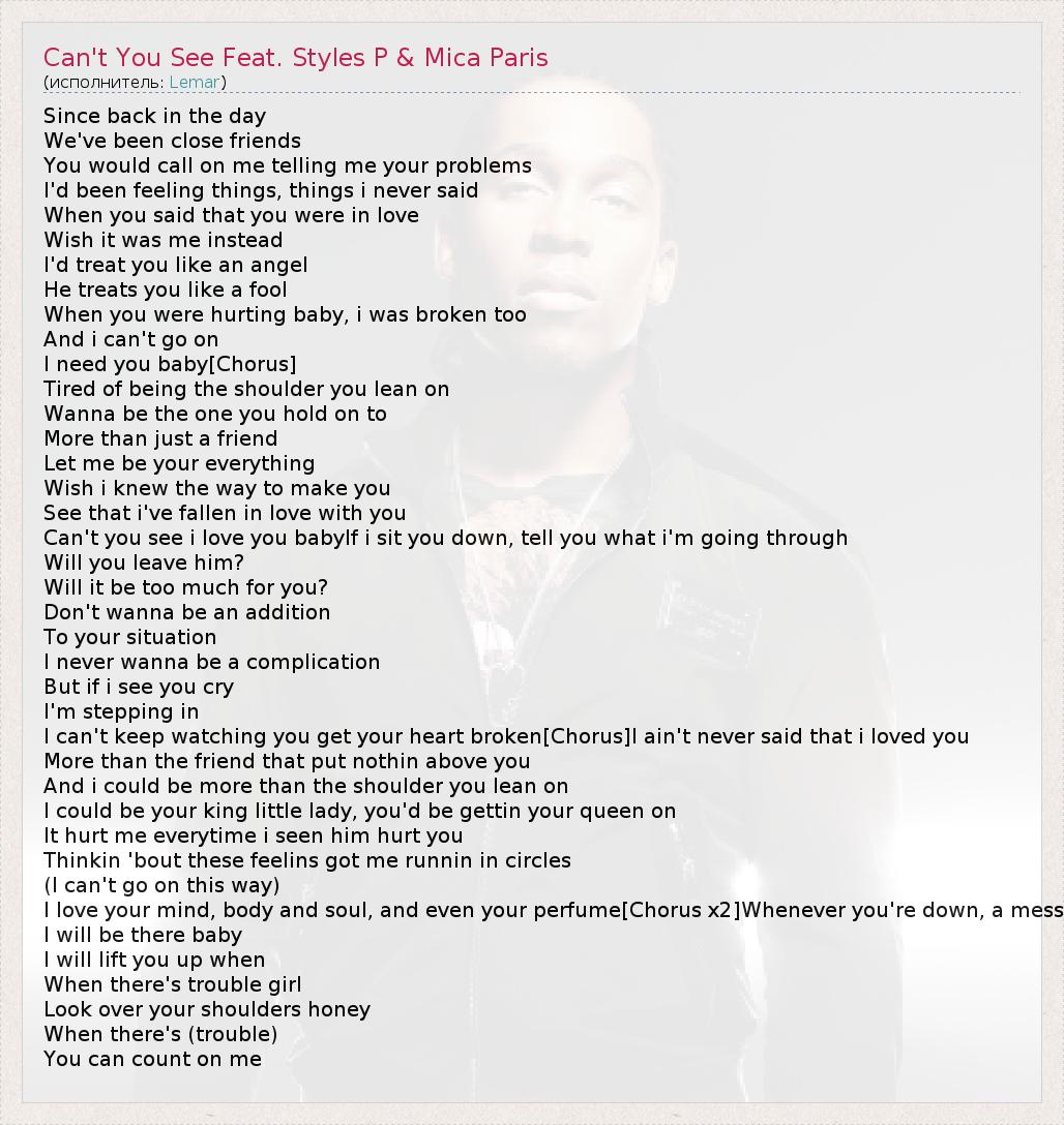 А как ты думаешь, о чем песня "Can't You See Feat. Styles P & Mica Paris" ?
