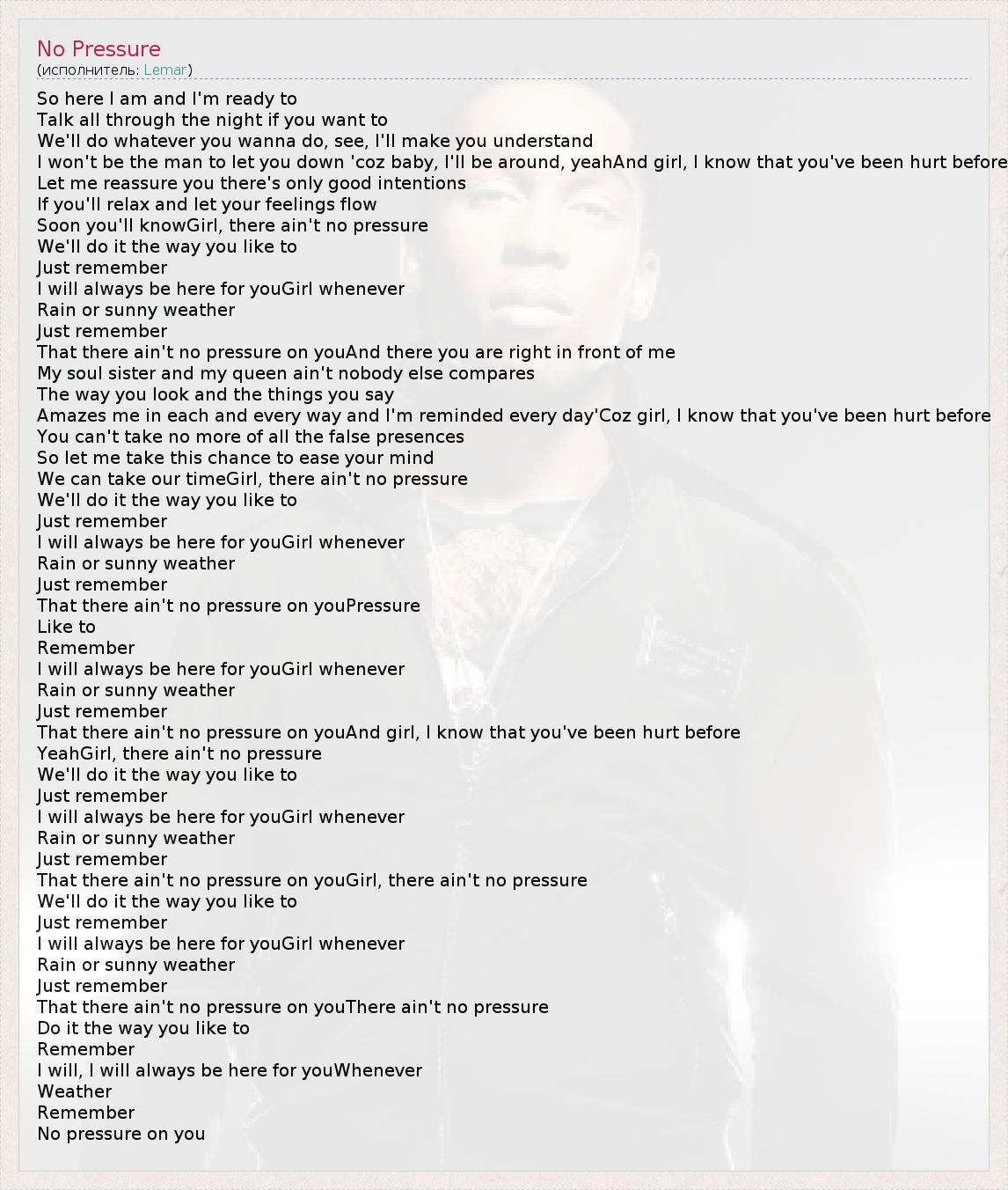 That there ain't no pressure on youAnd girl, I know that you've been hurt before