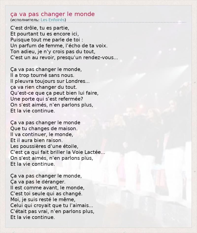 Так странно, ты ушла, Но, однако, ты все еще здесь, Ведь все мне говорит о тебе: Аромат женских духов, эхо твоего голоса, Твое прощание... я совсем в это не верю... Это похоже на скорое свидание, почти что встречу... Это не изменит мир, Земля достаточно вращалась без нас... Над Лондоном будут лить дожди, Но это ничего не изменит... Что же поделать С запертой дверью?... Мы любили друг друга, но ни слова больше об этом, И жизнь продолжается... Это не изменит мир, Если ты поменяешь свой дом. Мир будет продолжать существовать, На то будут причины. Пыль той звезды, Что заставит сиять Млечный путь... Мы любили друг друга, но ни слова больше об этом, И жизнь продолжается... Это не изменит мир, Не перевернет его с ног на голову. Он тот же, что прежде. Единственная ты изменилась, А я, я остался все тем же... Тем, кто считал, что ты любила его... Это не правда, но ни слова больше об этом, И жизнь продолжается...