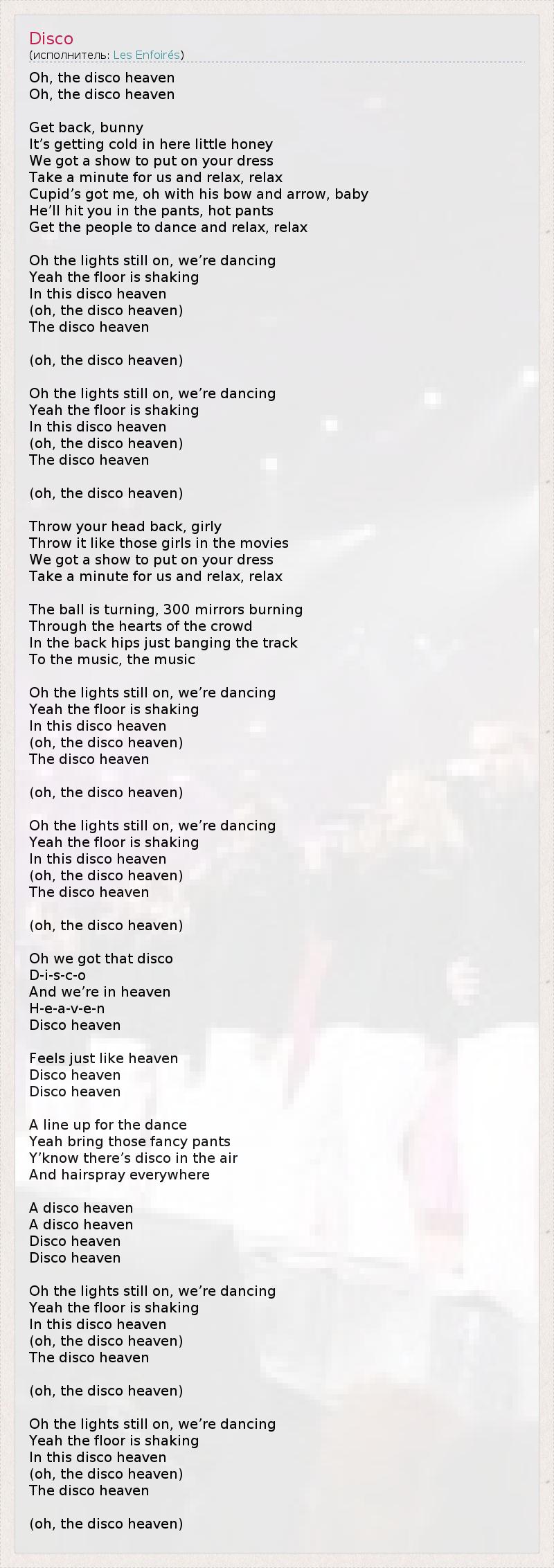 Дискотека "На небесах"... Дискотека "На небесах"... Малыш, вернись! Здесь становится прохладно, мой сладкий! На этом шоу можешь появиться в маске, Удели нам минутку внимания и расслабься! Купидон поразил меня своей стрелой, Он выстрелит тебе в брюки, где уже что-то взорвалось. Танцуй с народом и расслабляйся! Всё ещё горит свет, а мы танцуем, Сотрясая танцпол На этой дискотеке... (Дискотека "На небесах") Дискотека "На небесах"... (Дискотека "На небесах") Всё ещё горит свет, а мы танцуем, Сотрясая танцпол На этой дискотеке... (Дискотека "На небесах") Дискотека "На небесах"... (Дискотека "На небесах") Девчонка, встряхнись, Встряхнись так же, как те девочки в кино... На этом шоу можно появиться в маске, Удели нам минутку внимания и расслабься! Бал в самом разгаре, 300 зеркал прожигают Сердца тусовщиков. Стиляги зажигают под этот трек на краю танцпола Под музыку, под музыку... Всё ещё горит свет, а мы танцуем, Сотрясая танцпол На этой дискотеке... (Дискотека "На небесах") Дискотека "На небесах"... (Дискотека "На небесах") Всё ещё горит свет, а мы танцуем, Сотрясая танцпол На этой дискотеке... (Дискотека "На небесах") Дискотека "На небесах"... (Дискотека "На небесах") Мы на этой дискотеке - Д-и-с-к-о-т-е-к-е Мы на небесах - Н-а н-е-б-е-с-а-х Дискотека "На небесах"... Мы как будто в раю, Дискотека "На небесах"... Дискотека "На небесах"... Народ выстроился в очередь на танцпол, Все разодеты по последней моде.... Повсюду чувствуется атмосфера вечеринки, А воздух пропитан ароматом лака для волос... Дискотека "На небесах", Дискотека "На небесах", Дискотека "На небесах", Дискотека "На небесах"... Всё ещё горит свет, а мы танцуем, Сотрясая танцпол На этой дискотеке... (Дискотека "На небесах") Дискотека "На небесах"... (Дискотека "На небесах") Всё ещё горит свет, а мы танцуем, Сотрясая танцпол На этой дискотеке... (Дискотека "На небесах") Дискотека "На небесах"... (Дискотека "На небесах")