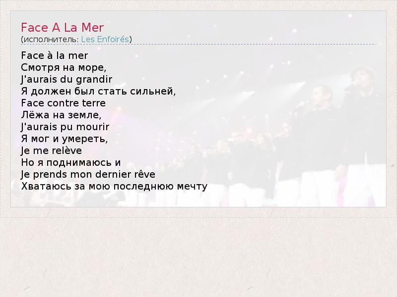 А как ты думаешь, о чем песня "Face A La Mer" ?